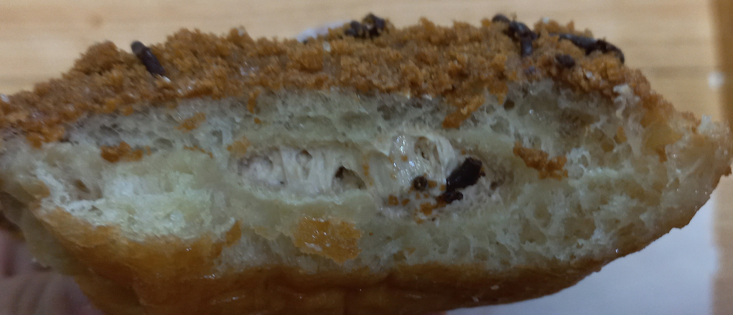 겉면에는 바삭한 쿠키가 뿌려져 있고, 속에는 달콤한 크림이 들어있었다