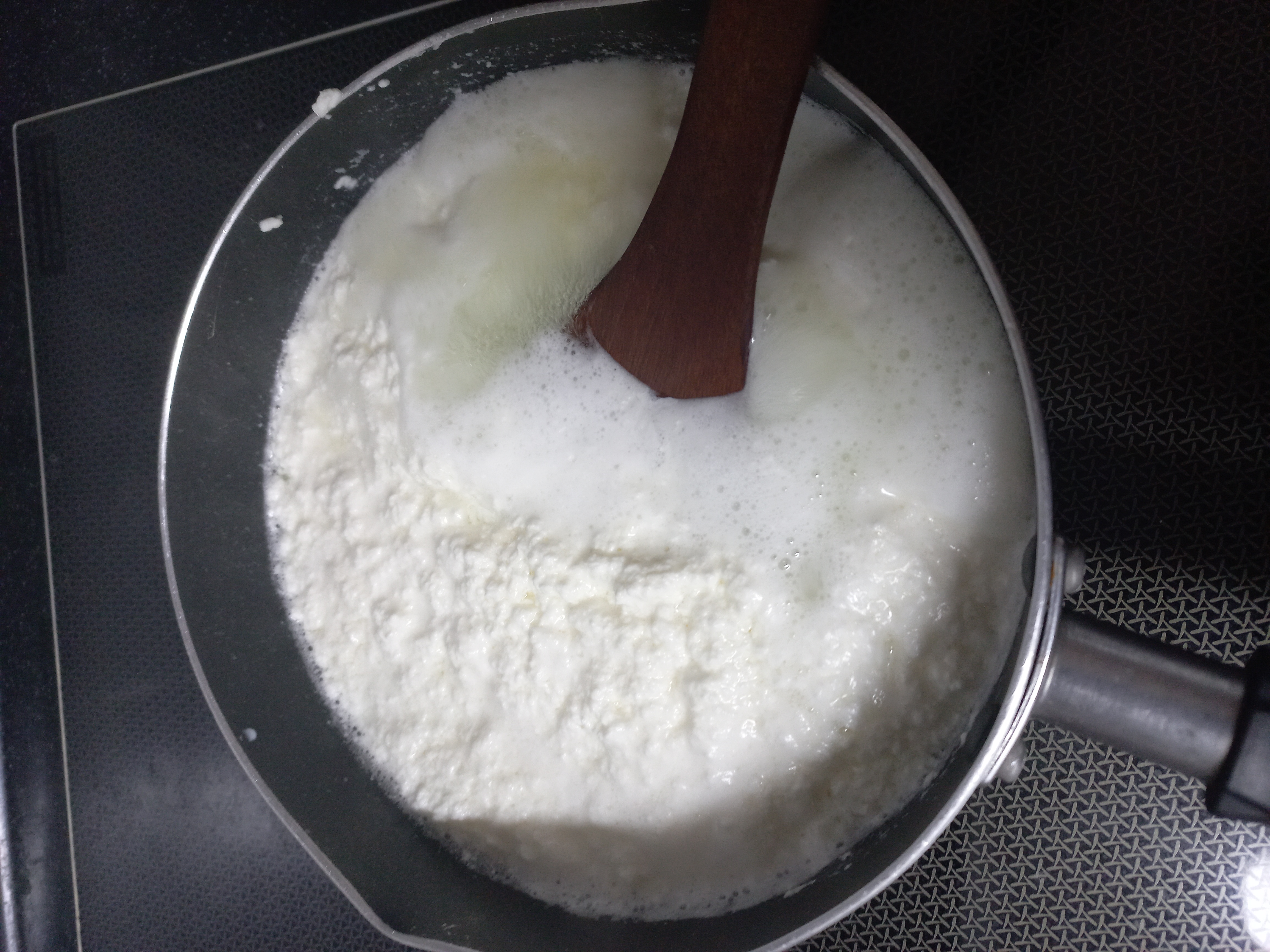 먼저 냄비에 우유 900ml를 넣고 중불에서 가열하며 저어주다가