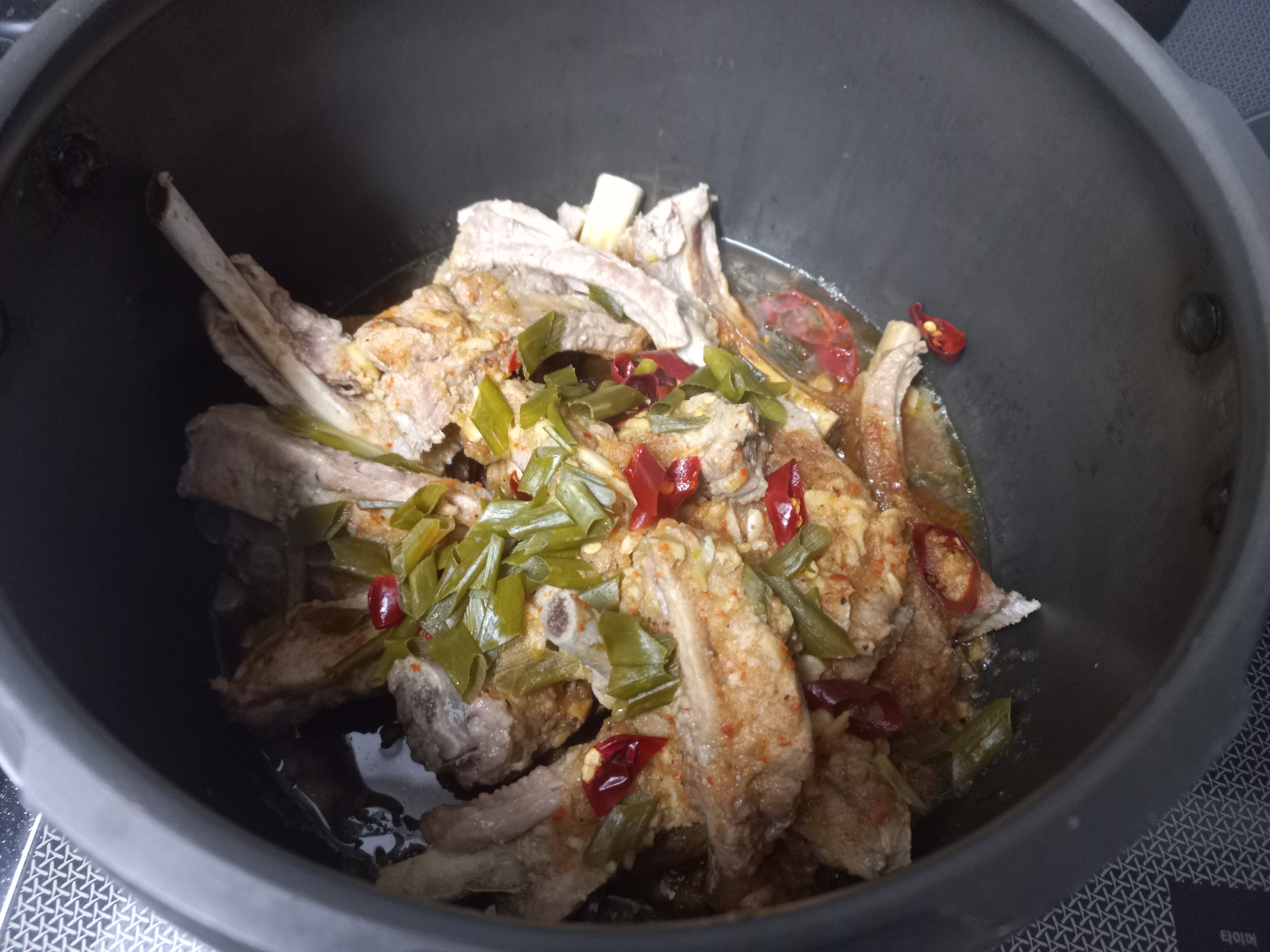 (5) 압력솥에 데친 등갈비, 양념장, 다진대파, 다진고추를 모두 넣는다