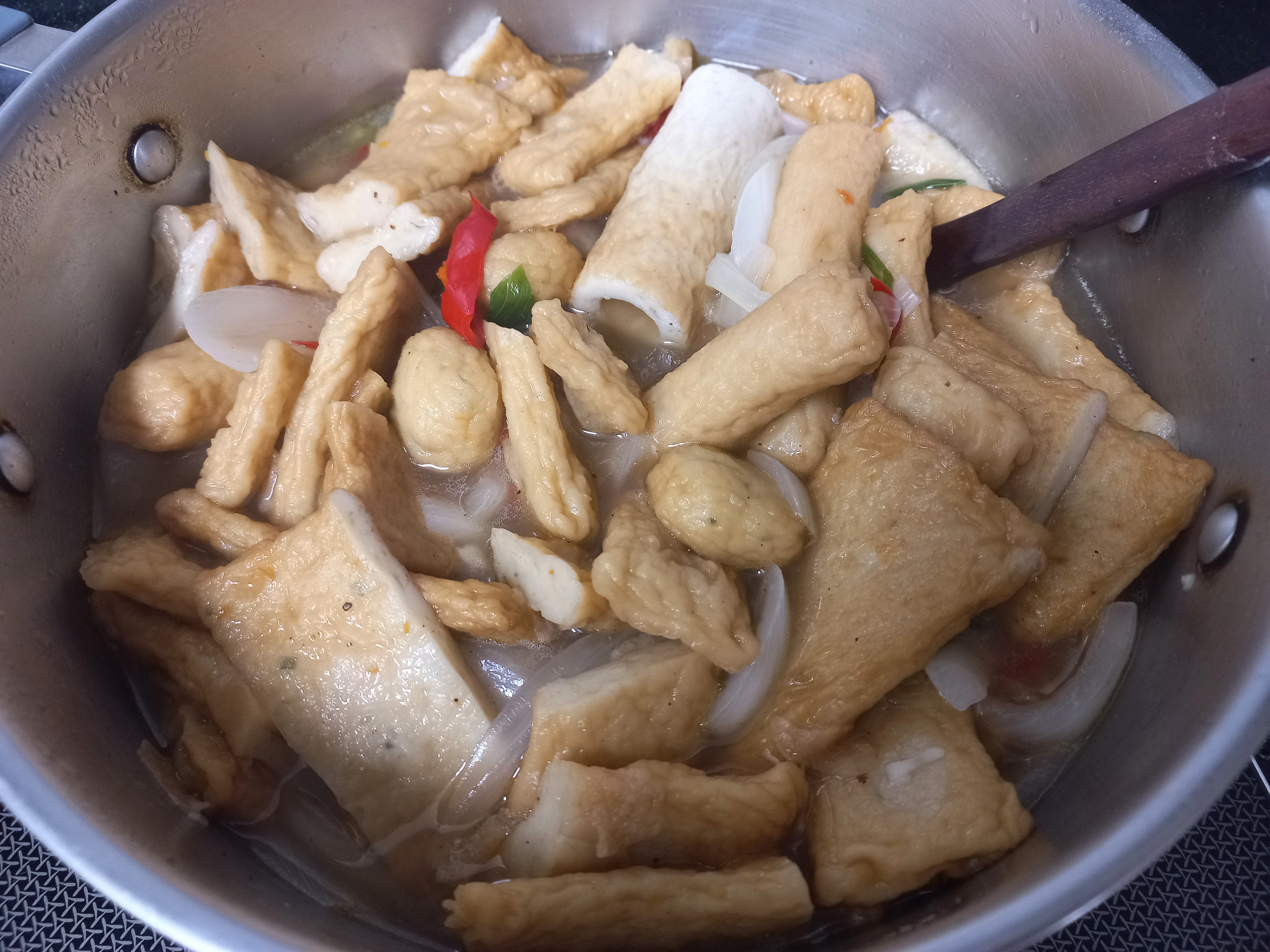 (5) 어묵, 양파, 홍고추, 대파를 모두 넣고 중불에서 끓인다